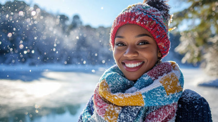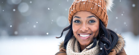 A cheerful woman with curly hair and a warm hat stands in a snowy forest, smiling brightly as snowflakes fall around her, embracing the joy of winter.