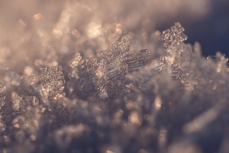 Close up of snow crystals in golden sunset light