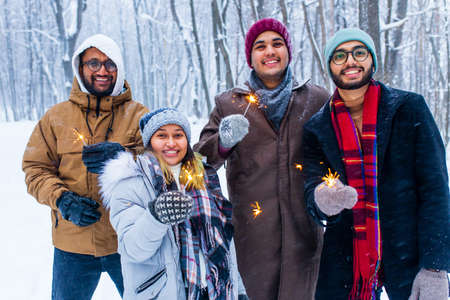 Image of a happy young friends with sparklers at Christmas party
