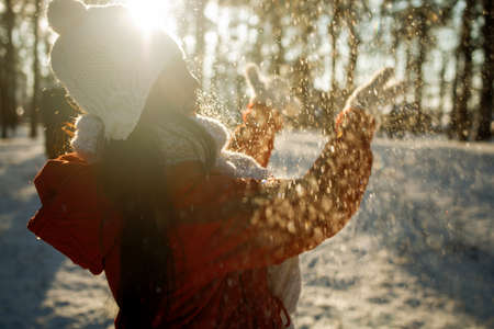 Asian girl enjoys winter, frosty day, snow. playing with snow, a woman throws white, loose snow into the air. Walk with winter forest.
