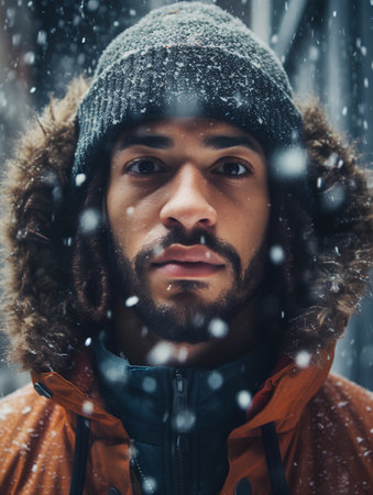 Portrait of a handsome young man with a beard in a warm jacket and a knitted cap on a background of snowfall. Winter fashion.