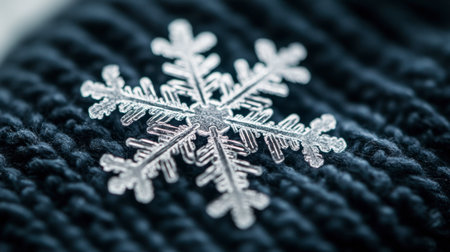 A close-up view of a frosted snowflake resting on a cozy knit fabric, creating a beautiful contrast between the delicate design and the textured background.