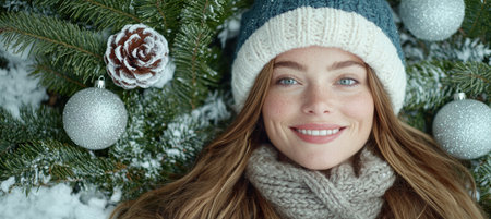 smiling woman in winter clothing near christmas decorations