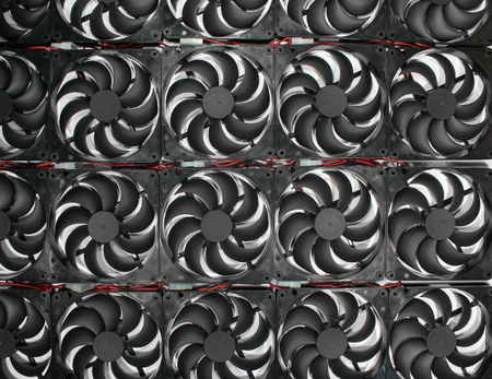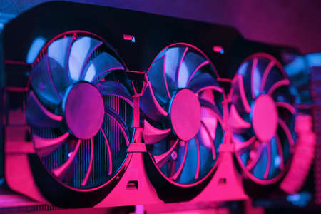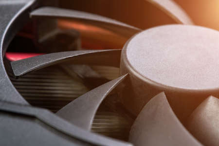 Close up of a computer graphic card. Computer hardware fan. Technology background
