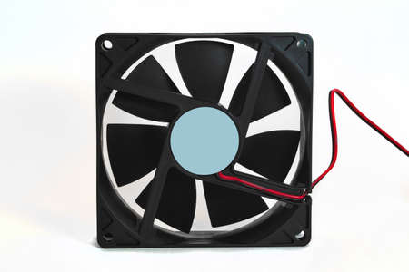 One black plastic fan for desktop computer or notebook for cooling processor and other components isolated on white background.