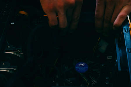 LOS ANGELES, USA 25 APRIL 2021: Gaming pc interior detail illuminated with rgb fan