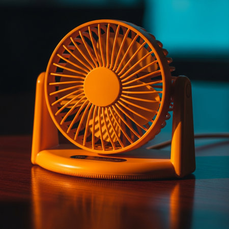 Orange electric fan on a wooden table. Close up. Selective focus.