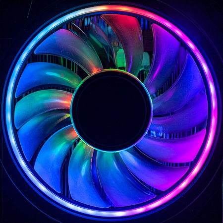 A close-up view of a high-performance computer fan, its blades spinning rapidly. The integrated RGB LEDs cast a vibrant, multicolored glow, creating a mesmerizing circular pattern of light.