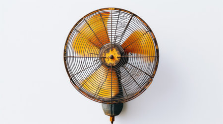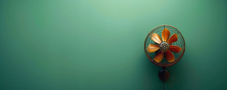 Vibrant Retro Wall Mounted Fan Against Minimalist Teal Background Perfect for Vintage Home Decor and Cooling Concepts AI Generative