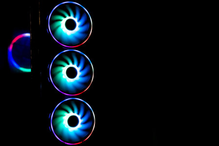 Computer cooler with RGB LED light. Computer circuit board and CPU cooling fans illuminated