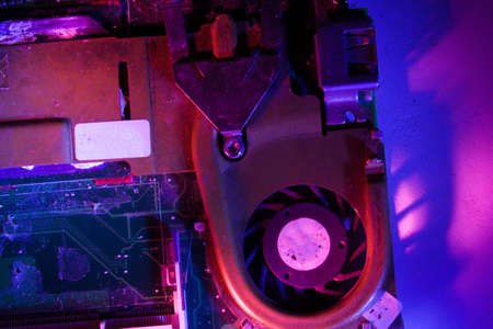 Closeup laptop fan, inside computer, repair brocken fan of laptop computer, repair service business and technology concept