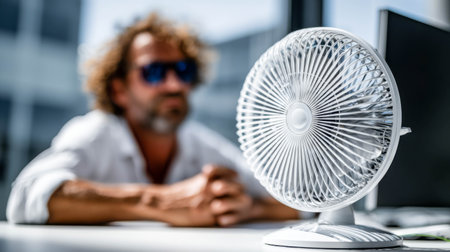 Man sitting at desk with small fan, seeking relief from extreme heat in a bright office environment