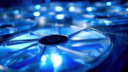 This image captures a close-up view of bright blue LED cooling fans featuring circular blades against a modern technological background, illustrating innovation and efficiency.