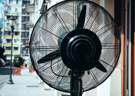 Vintage electric fan on the table in the living room. Shallow depth of field