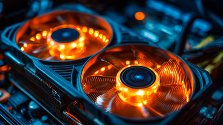 Vibrant LED-lit fans spin within a high-performance graphics card, casting colorful glows inside a sleek gaming rig, enhancing its dynamic, futuristic atmosphere.