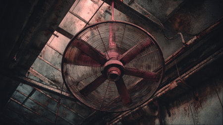 This image captures a vintage industrial ceiling fan suspended from a rustic warehouse ceiling, highlighting exposed pipes and weathered concrete walls, creating an atmospheric vibe.
