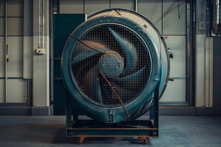 Large industrial fan standing on wheels inside a factory building