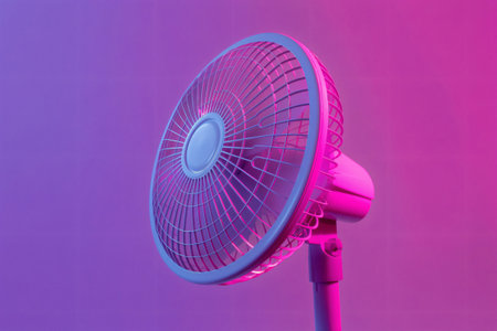 Portable desk fan is blowing against a bright pink and purple background with copy space