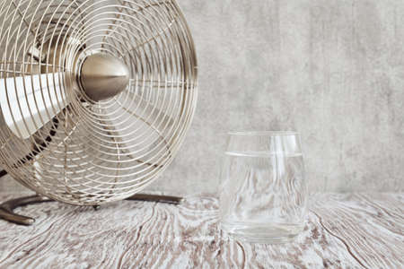 Transparent glass of clear water and a small table fan on a wooden table closeup, shallow depth of field