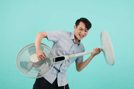 Young businessman suffers from heat while working in the office and tries to cool off by the fan