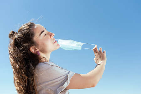 Breathing and feeling free during Coronavirus pandemic concept. Young woman removing a protective surgical mask.