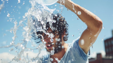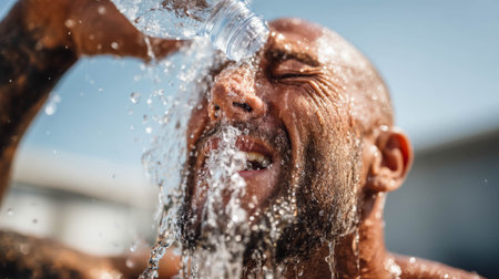 Man enjoying refreshing water splash on face during extremely hot summer day outdoors