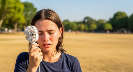 Young woman cooling off with handheld fan in hot weather at outdoor park during summer