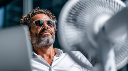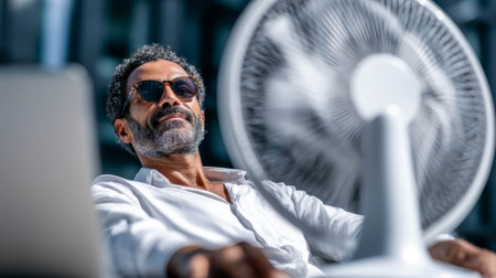 Man relaxing in hot weather with sunglasses and fan providing cool breeze for comfort