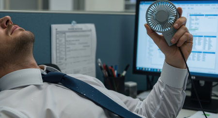 Man enjoying cool breeze from fan in bright office during extremely hot weather conditions
