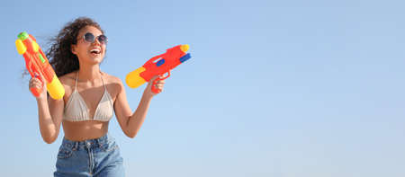 African American woman with water guns having fun against blue sky
