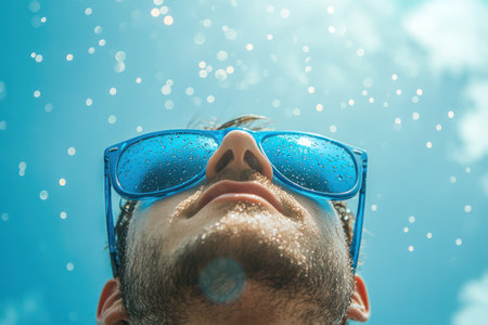 Stylish man enjoys sunny weather, looking upward as water drops sparkle on sunglasses, capturing cool summer vibe and refreshment.