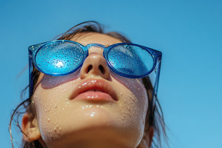 A woman with water droplets on her blue sunglasses gazes upward at the sky, enjoying a bright and refreshing sunny moment.