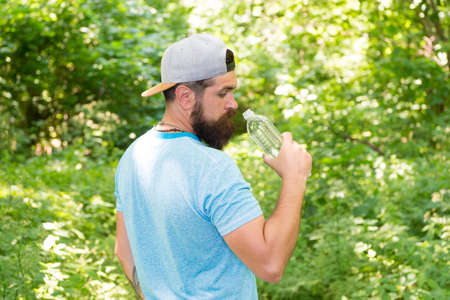 Every Sip Counts. mature guy in hat. thirsty hipster traveler. drinking water in forest outdoor with sunset nature on background. Bearded man with water bottle. fitness portrait of bearded man
