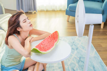 asian unhappy woman is sitting in front of working fan with watermelon suffering from summer heat at home