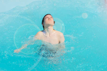 a wet guy jumps out of the water of the pool with closed gases in the sun, a man bathes me in the pool on a summer day, private recreation.
