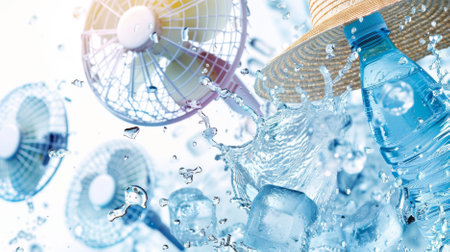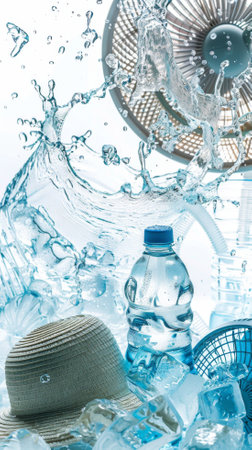 Summer heat danger concept. Water splashes, fan, hat, ice cubes and bottled water, AI generated