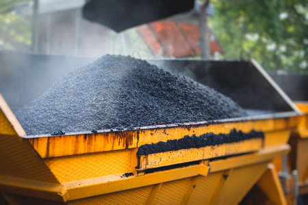 tractor unloading hot asphalt into the pit. road repair. black and white photography