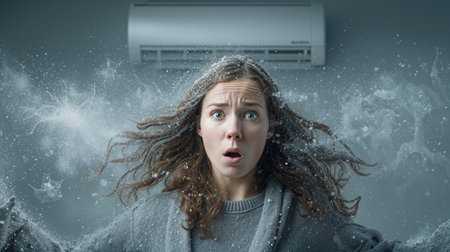 Surprised woman reacts to unexpected cold in indoor setting with air conditioner