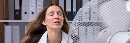 Mature Businesswoman Cooling Herself In Front Of Fan During Hot Weather