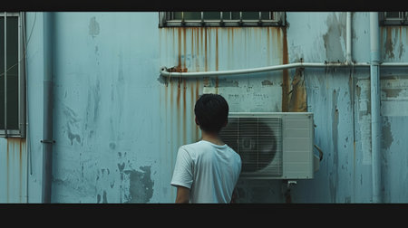 A person stands in a narrow alleyway, gazing up at large air conditioning units in a quiet urban environment during the day