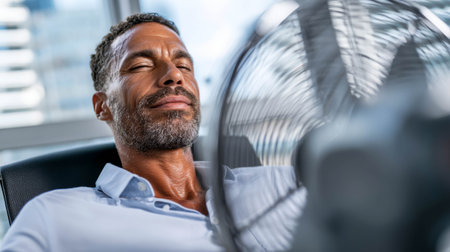 Man enjoying cool breeze from fan in bright office during extremely hot weather conditions