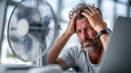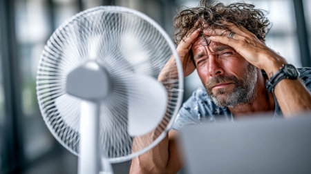 Frustrated man struggling with extreme heat while sitting near a fan in a bright indoor space