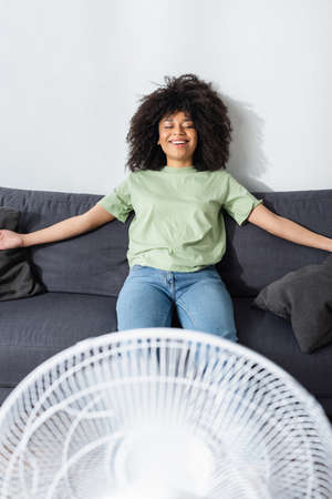 blurred interracial man and woman sitting on couch near electric fan in living room