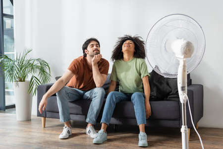 cheerful interracial man and woman sitting on couch near blurred electric fan in living room