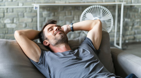 A man reclining on a couch, basking in the breeze of a fan nearby.
