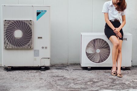 Beauty young woman with air conditioning. near the happy fan. Long hair. Fashionable lady with a beautiful hairdo, makeup. against the background of the outdoor air conditioner.