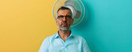 A thoughtful man relaxes in front of a fan against a vibrant backdrop, capturing a moment of cool serenity.