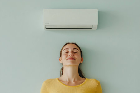Young woman relaxing with closed eyes, enjoying cool air from air conditioner in light green room, wearing yellow top, exuding tranquility and comfort