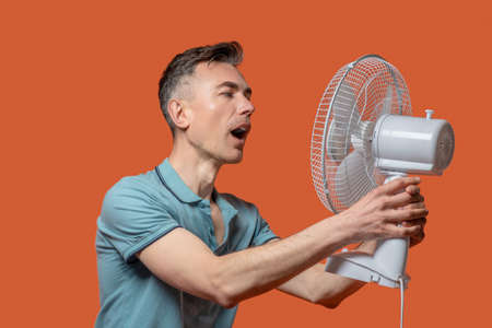 Man enjoying cool breeze from electric fan while relaxing in extremely hot weather outdoors
