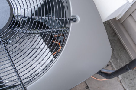 Detailed close-up of an outdoor air conditioning unit, highlighting its fan mechanism and surrounding environment in bright daylight. Ideal for illustrating summer comfort and technology.